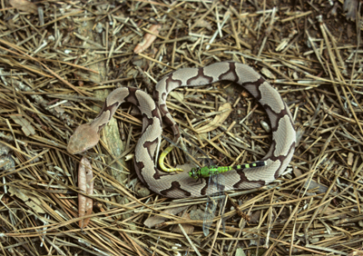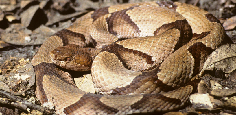 The Copperhead, Agkistrodon contortrix, is the only species of venomous snake commonly found in Forsyth County, N.C. In addition to a copper-colored head, hour-glass markings run the length of the body. Juveniles possess the same pattern, but also display a yellow or greenish tail tip that is used to lure small prey. Copperheads use heat-sensitive pits on either side of the head to detect the rodents, birds, insects, and amphibians on which they feed. Like other “pit vipers”, they also have hollow fangs to inject venom into prey. Because these fangs are also used in defense, it’s good to know some strategies to help minimize encounters. First, never try to handle a venomous snake and make sure that children know to leave snakes alone. Create a backyard habitat that is non-attractive to copperheads by eliminating sources of food, water and shelter. Practices such as placing pet food outdoors or allowing birdseed to collect on the ground can attract rodents, which may also attract snakes. Overgrown hedges, tall grass, trash, and other forms of debris provide hiding places and allow water to collect. Be aware that copperheads are more active at night, so carry a flashlight and skip going barefoot on summer evenings. Fortunately, copperhead bites are rarely fatal to humans and only one death has been documented in North Carolina. However, all venomous snake bites should be considered serious, requiring prompt medical attention. Immediately call 911 and keep the victim calm until professional help can be obtained.