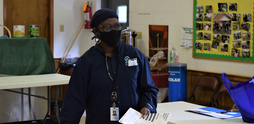 Originally planned as a drive-by enrollment event, it was moved indoors at the church due to weather concerns. To prevent the spread of COVID-19, social distancing was practiced as everyone was spaced at least six feet apart as they filled out paperwork. Everyone wore masks and used hand sanitizer. Tables and scales were wiped down with sanitary wipes after they were used.