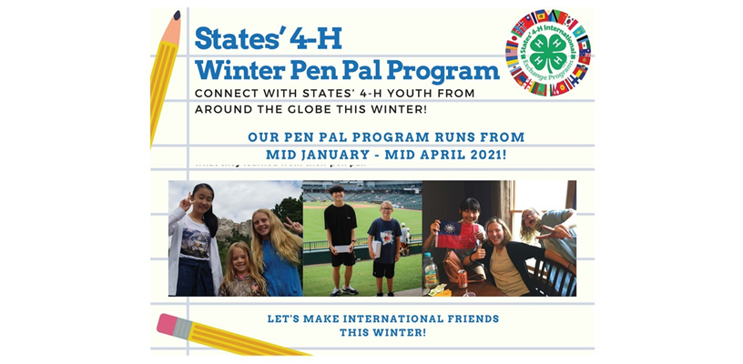 Are you interested in learning about a different culture? Youth ages 9-18 can do that through a pen pal! Pen pals will exchange at least two correspondences a month from January 18 - April 18. Matches will be made based on the answers provided in a survey. The survey, and more information can be found at https://nc4h.ces.ncsu.edu/2020/11/4-h-winter-penpal-program-sign-up-today/