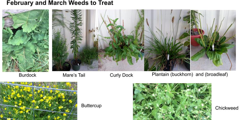 February-March is the time to spray for buttercups, chickweed, common burdock, and curly dock. March is the recommended time to spray for Marestail (or April), Poison Hemlock, Dandelion, Wild Garlic (into April), and Plantain. Don't let time slip away from you and the weeds get too big to control!