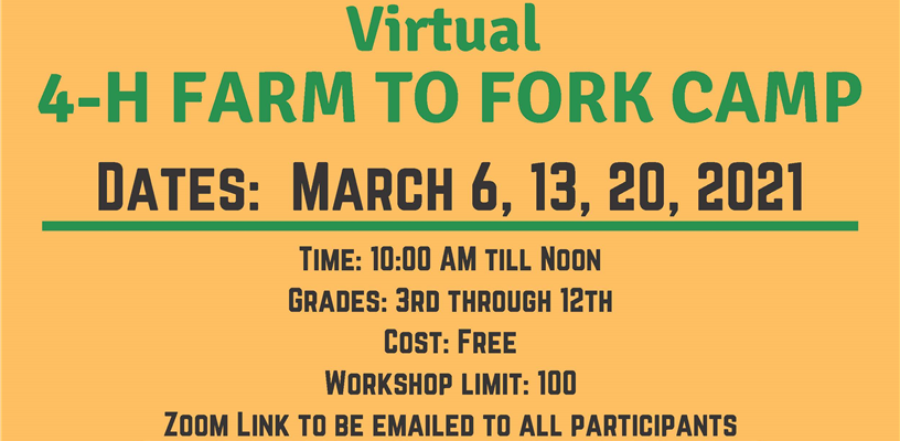 The Farm to Fork Camp Local Foods Work Group is hosting a statewide 4-H Virtual Farm to Fork Camp for 4-H youth grades 3-12 on March 6, 13, and 20, 2021, from 10 a.m. until noon. Do you know where your food comes from? Do you like to cook? If so, join us for the 4-H Farm to Fork Camp. Youth will learn about the food on your plate and where it came from. This camp will include 3 sessions. Participants will learn about agriculture, virtually visit local farms and learn to prepare delicious dishes using local ingredients. There will be a 4th session that participants will complete on their own. Once the sessions are complete, we will announce a competition where 4-H’ers will compete in a Virtual Healthy Food Challenge. During this competition, participants will take a mystery basket of ingredients and transform it into an amazing dish!