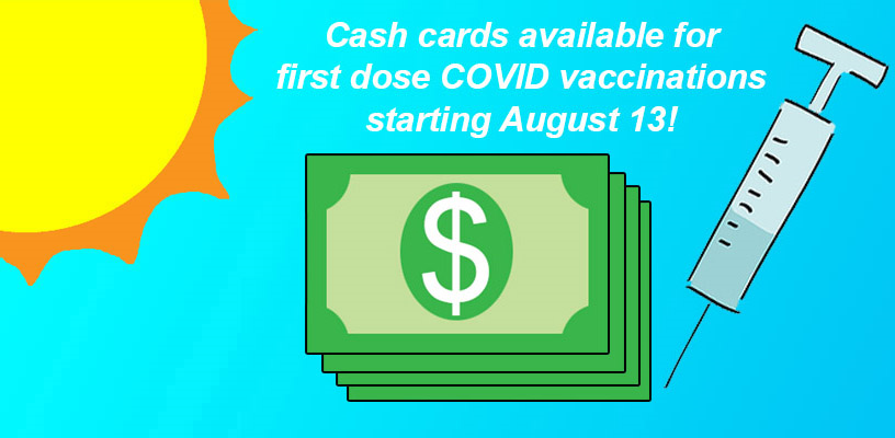 One hundred dollars worth of cash cards are available to anyone 18 and older who receives their first dose of any COVID-19 vaccine, and $25 cash cards are available to non-commercial drivers who take someone to receive their first dose. Drivers will only receive one cash card per trip.