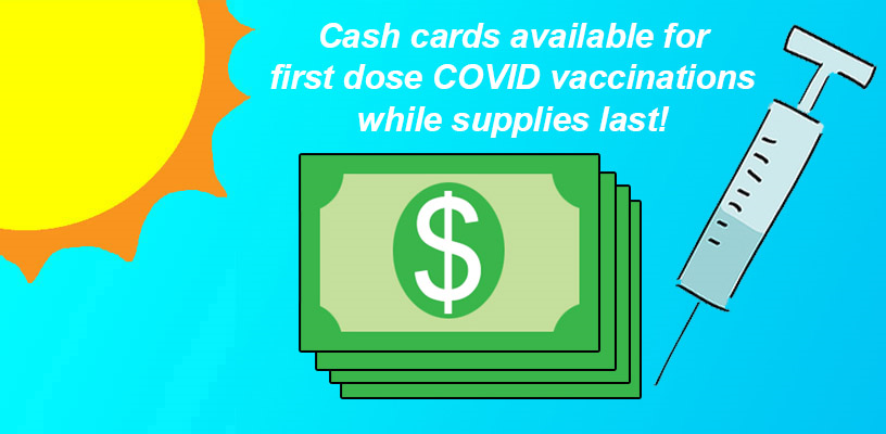 One hundred dollars worth of cash cards are currently available to anyone 18 and older who receives their first dose of any COVID-19 vaccine, and $25 cash cards are available to non-commercial drivers who takes an adult to receive their first dose. Qualifying individuals are eligible for one offer per visit. The cards are for first doses only, and each patient’s COVID vaccination history will be checked before the shot is administered or the cash card is given. Cards will be available while supplies last.
