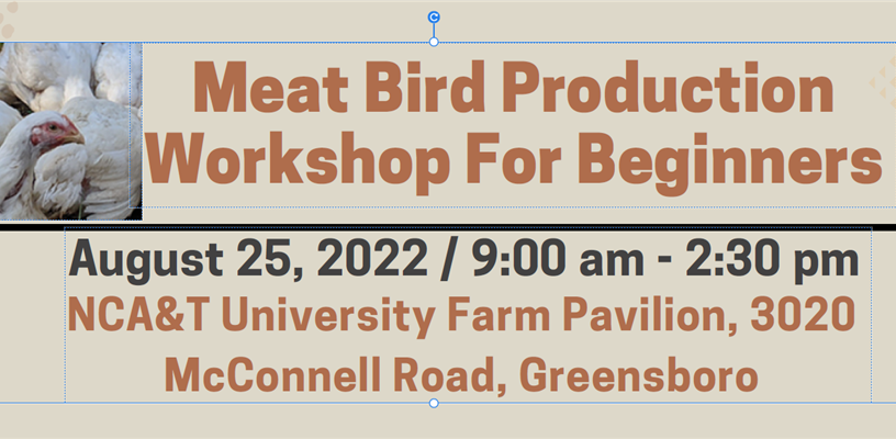 There will be a Meat Bird Production Workshop for Beginners at NCA&T University Farm Pavilion at 3020 McConnell Road, Greensboro on August 25 from 9 a.m. until 2:30 p.m. Topics include: