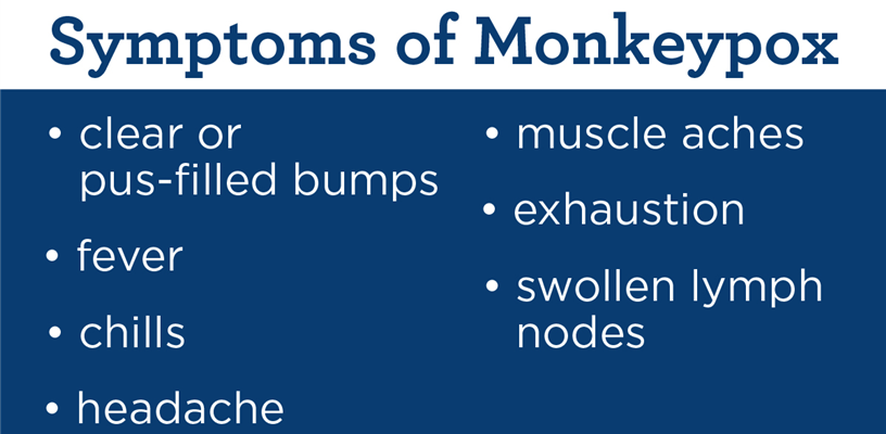 The monkeypox rash may initially appear similar to pimples, blisters, or raised bumps that appear on the face, inside the mouth or other parts of the body, like hands, feet, chest, genitals, or anus and may be accompanied by fever, headache, muscle aches and backache, swollen lymph nodes, chills and exhaustion. The rash may be painful and itchy, and will go through several stages before healing, including scabs.