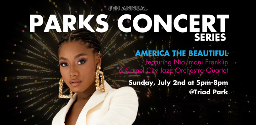 Forsyth County Government and the Arts Council of Winston-Salem and Forsyth County will present America the Beautiful, a concert starring Nia Imani Franklin and the Camel City Orchestra Quartet on Sunday, July 2, from 5-8 p.m. at Triad Park.