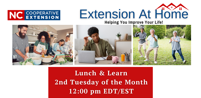 The Extension At Home Program Series 2024 is a monthly lunch and learn program brought to you by a collaboration of N.C. Cooperative Extension Agents around the north central district of North Carolina. This series will feature a new topic each month related to Family and Consumer Sciences topics. See the topics listed below for July through December 2024.